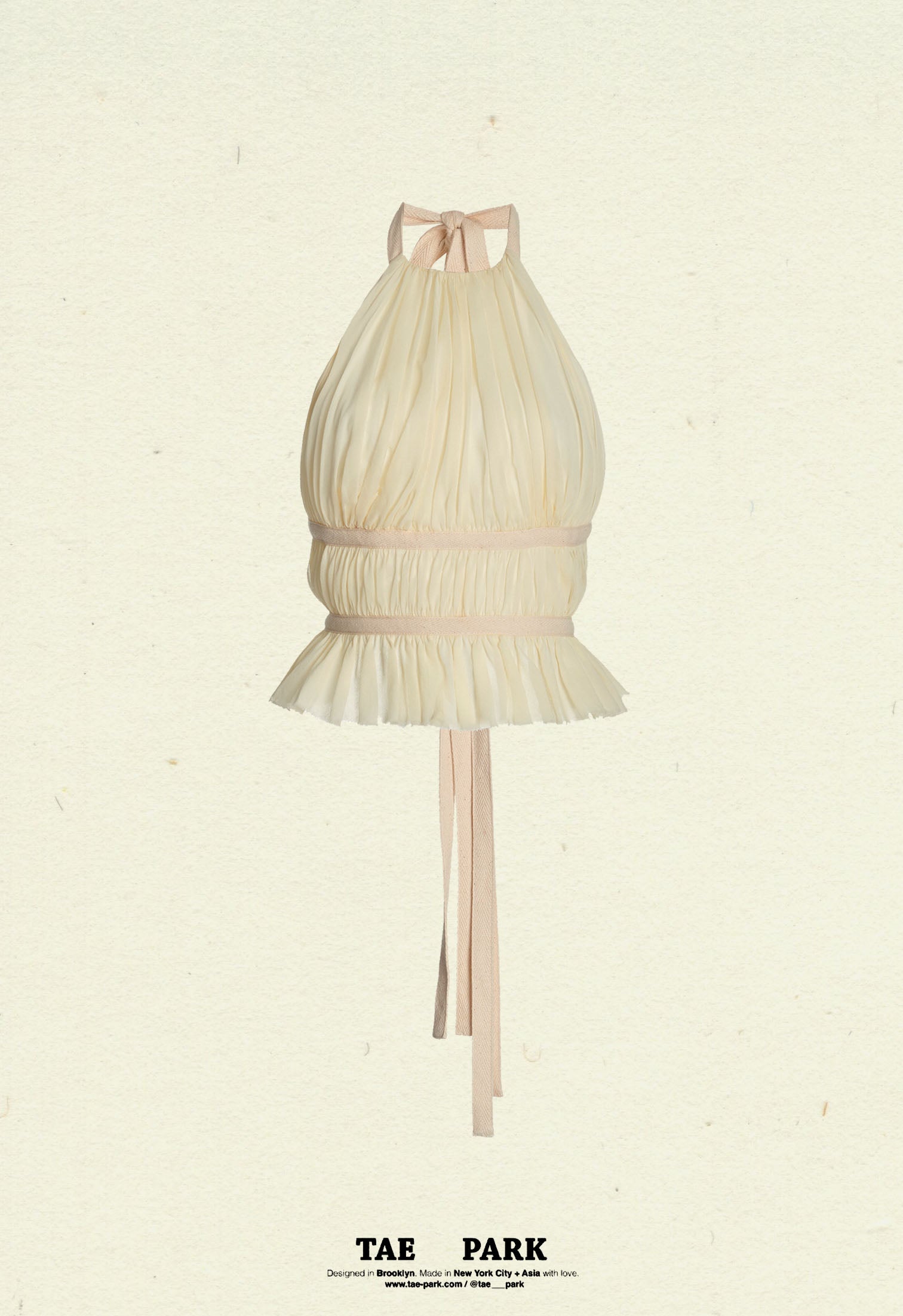 Dramatic and delicate pure silk chiffon, crafted in hand maneuvered ruching details at front. Three tiered ruching with double rows of natural cotton ties in exaggerated lengths. Layers of chiffon at body for additional coverage support. Mini peplum with raw edge precision at hem.