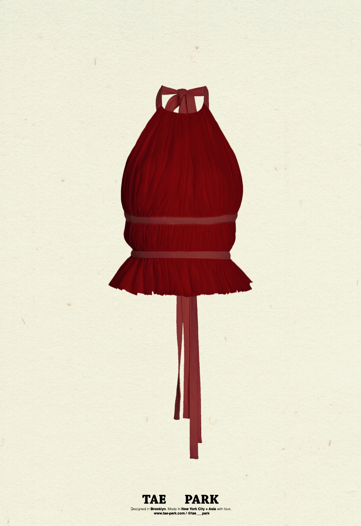 Dramatic and delicate pure silk chiffon, crafted in hand maneuvered ruching details at front. Three tiered ruching with double rows of natural cotton ties in exaggerated lengths. Layers of chiffon at body for additional coverage support. Mini peplum with raw edge precision at hem.