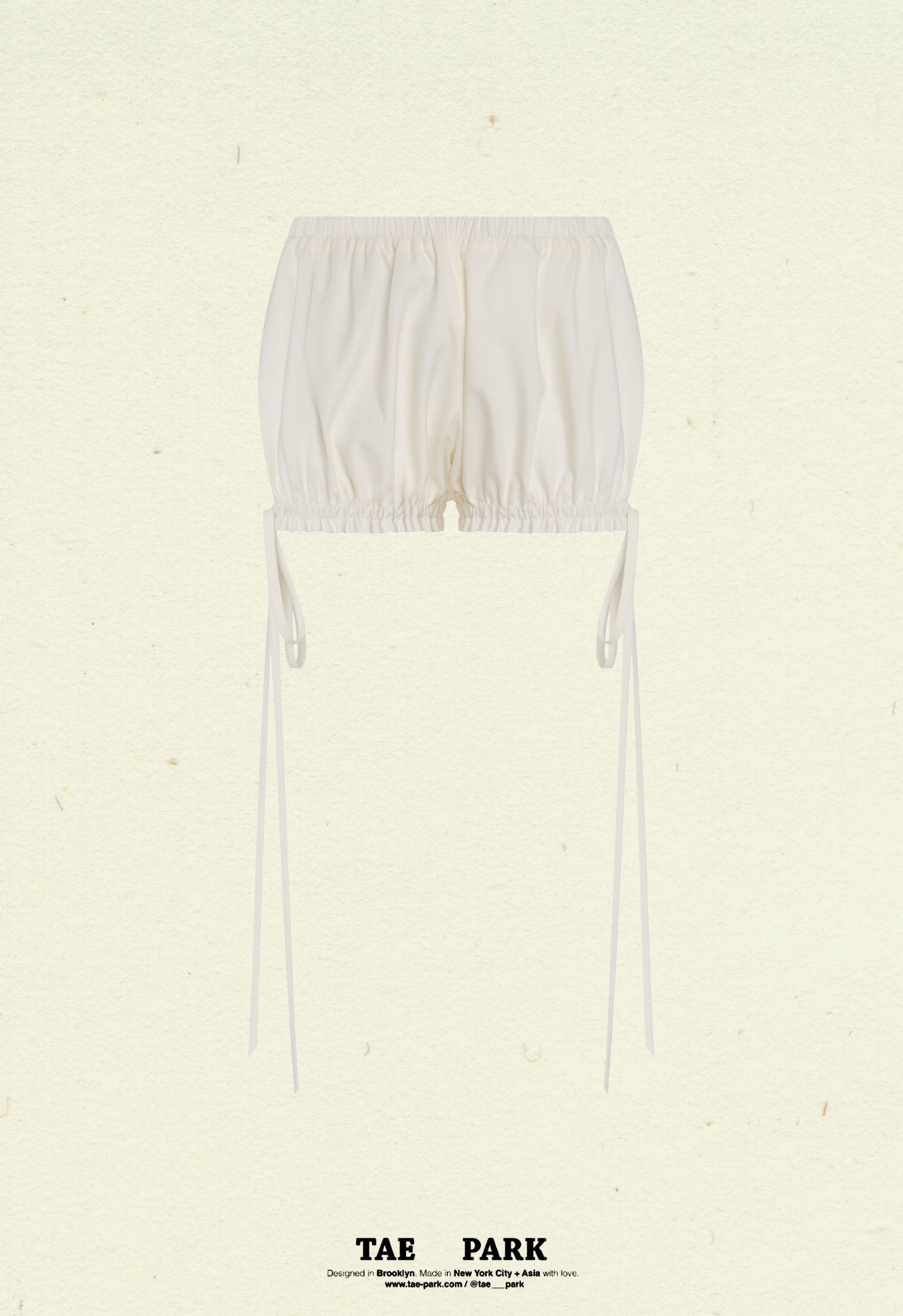 Ruched waistband for ample stretch. Raw edge ruffle detail at hem. Have fun with the exaggerated cotton straps on side; tie an oversize bow on the side or criss-cross wrap around your legs.
