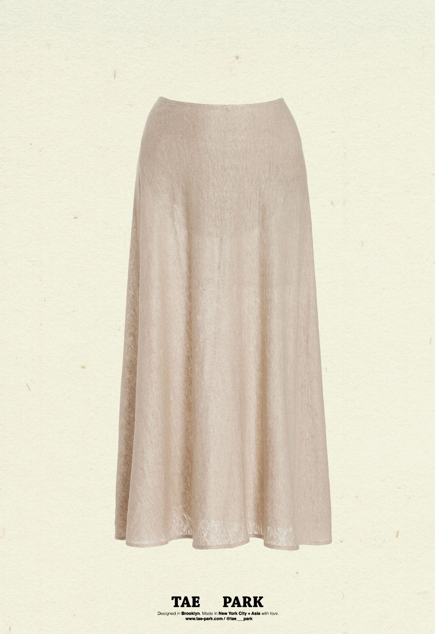 Mid-length bias skort with darted shorts attached. Made with elevated linen knit. Invisible zipper and hook , with darts at front and back& eye at center back for closure. Slight sheer on linen knit for that flirty vibe.