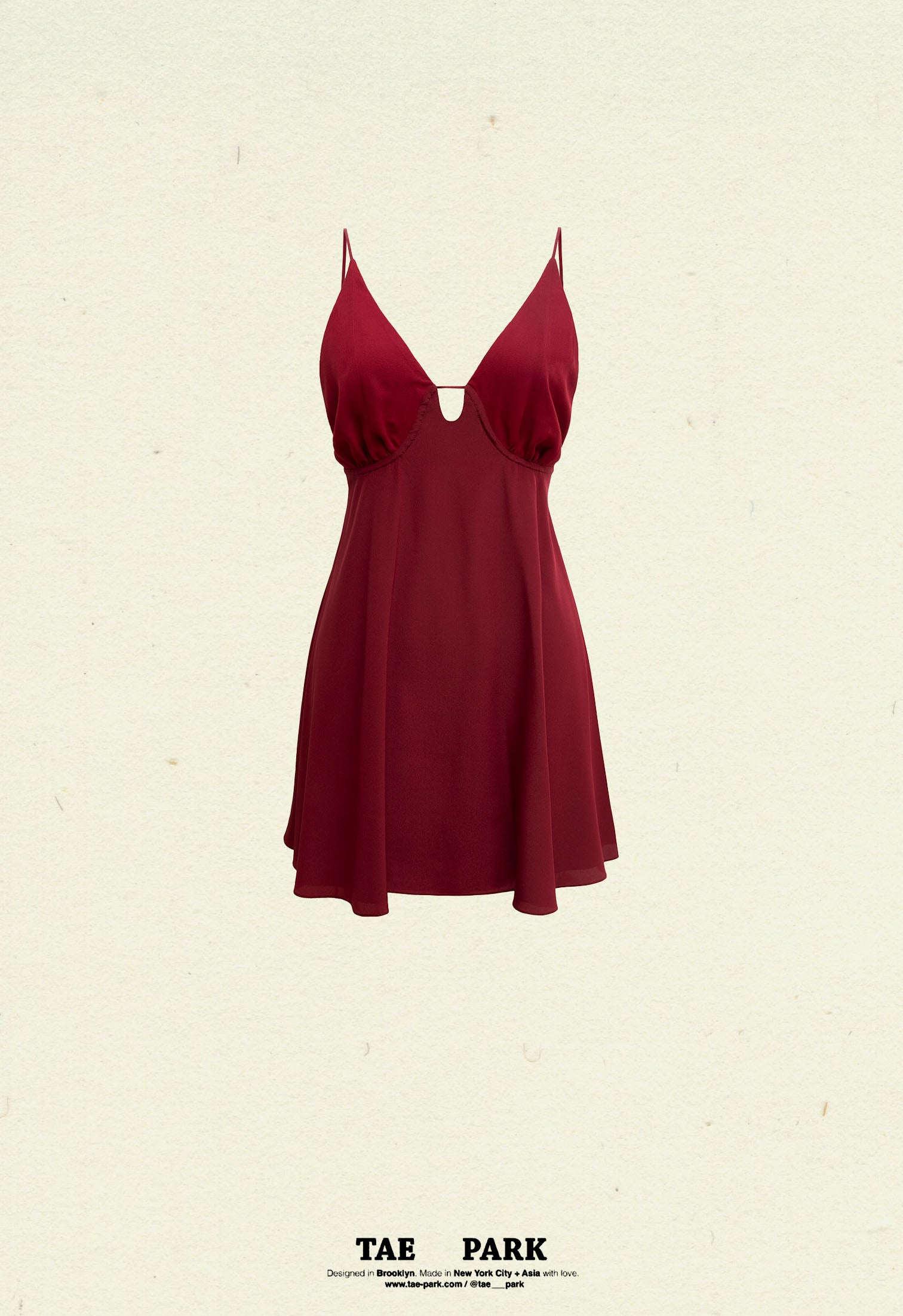 Bias-cut, double-lined body with scooped u neckline. Seamed cup with functional tie tunnel below bust, featuring various fit range for the wearer’s bust. Silk string tie at shoulder straps, with self-adjust double rows of bow tied at back. Invisible zipper with hand sewn hook & eye at center back. French seam finishing inside the A-line skirt body.