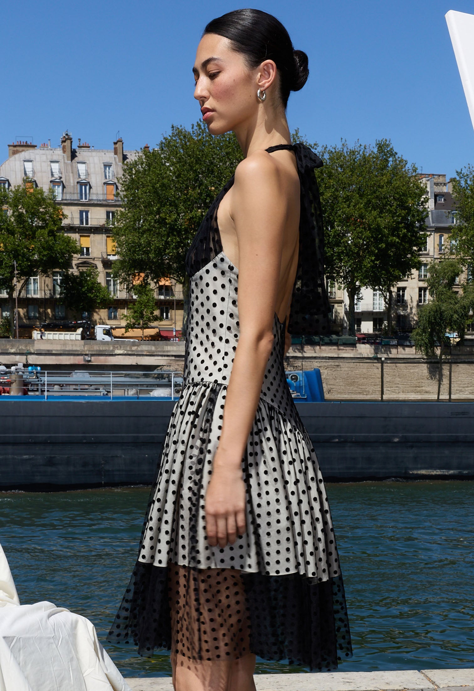A halter-neck bodice with a plunging neckline, fitted at the waist to hug the body with a flared voluminous skirt to flatter one's curve. Carefully ruched at bust with an exaggerated ribbon neck tie for added adjustability. Contrast layering with our staple ivory pima cotton and our romantic velvet polka-dot mesh in varied lengths. Open back, fit with an invisible zipper at back with hook & eye.