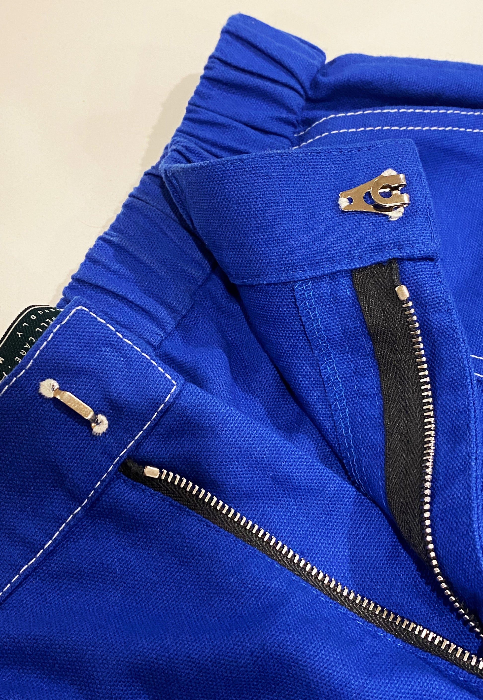 Constructed in sturdy duck canvas cotton with thick contrast top stitch. Ruched elasticated waistband, Lampo zipper and hand sewn silver hook and bar closure. Low waisted fit. Functional pockets at front, back. Carpenter Strap detail to dangle your accessory, towel rag, gloves..you name it.