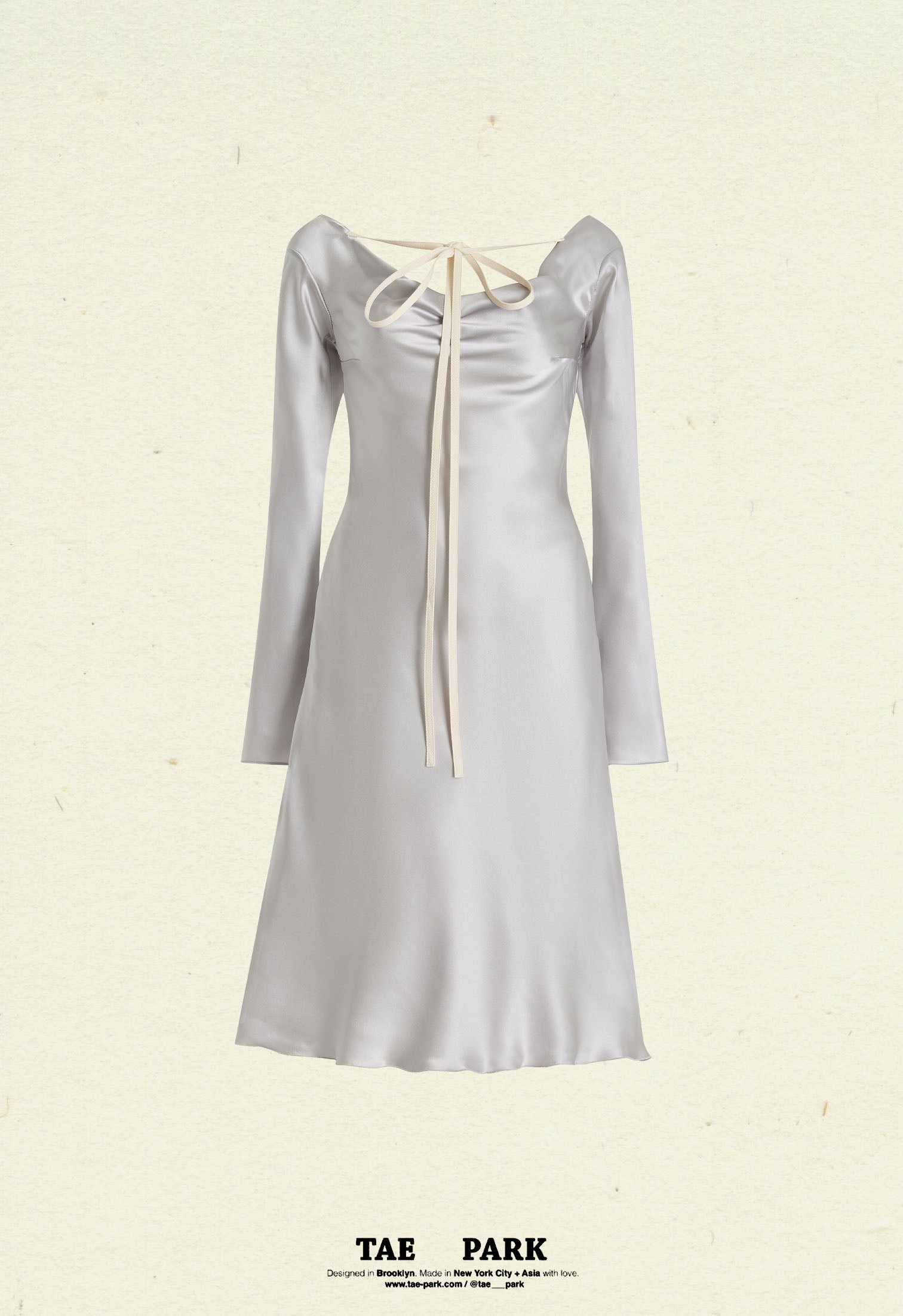 Featuring a cowl neckline and meticulously finished French seams. Elongated sleeve length with a subtle flair adds a touch of drama. Find a small loop near one's wrist, inviting you to thread your favorite jewels through for a personalized cuff shape.