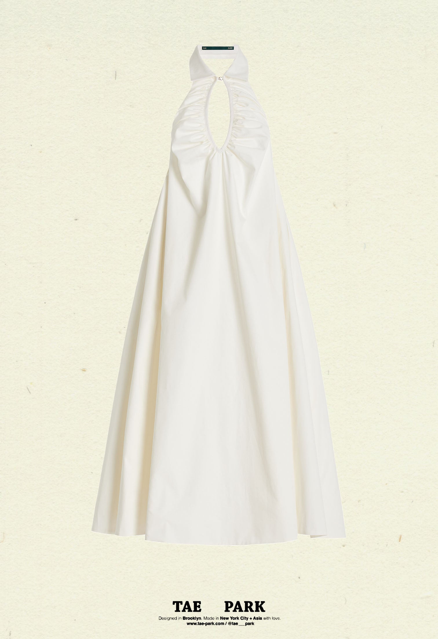 The Ruched Halter Balloon Dress Maxi, in our off-white color way, the sister dress to our mini.