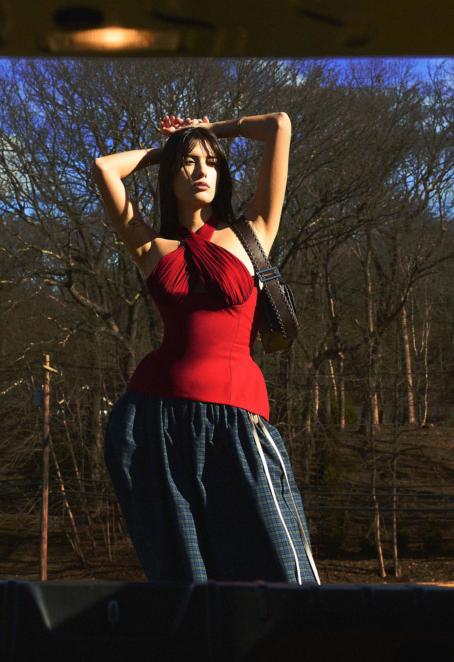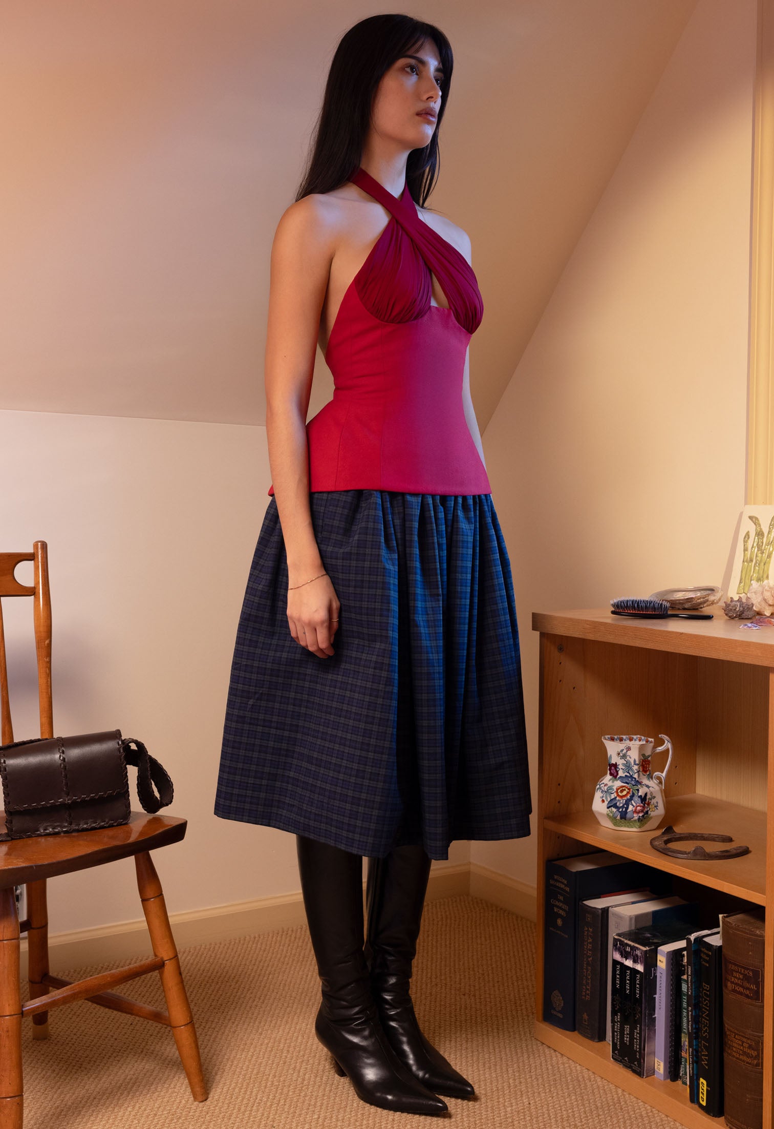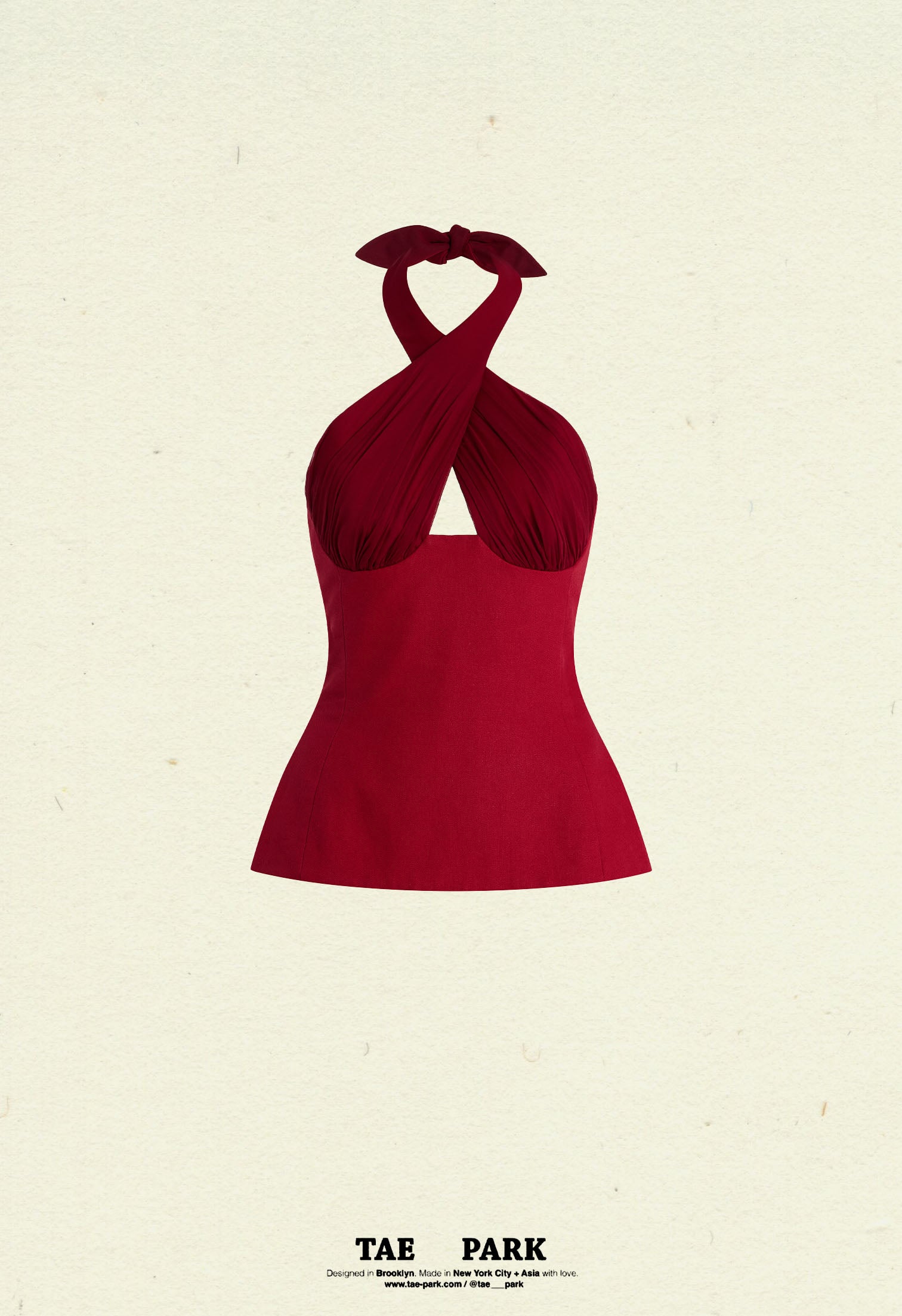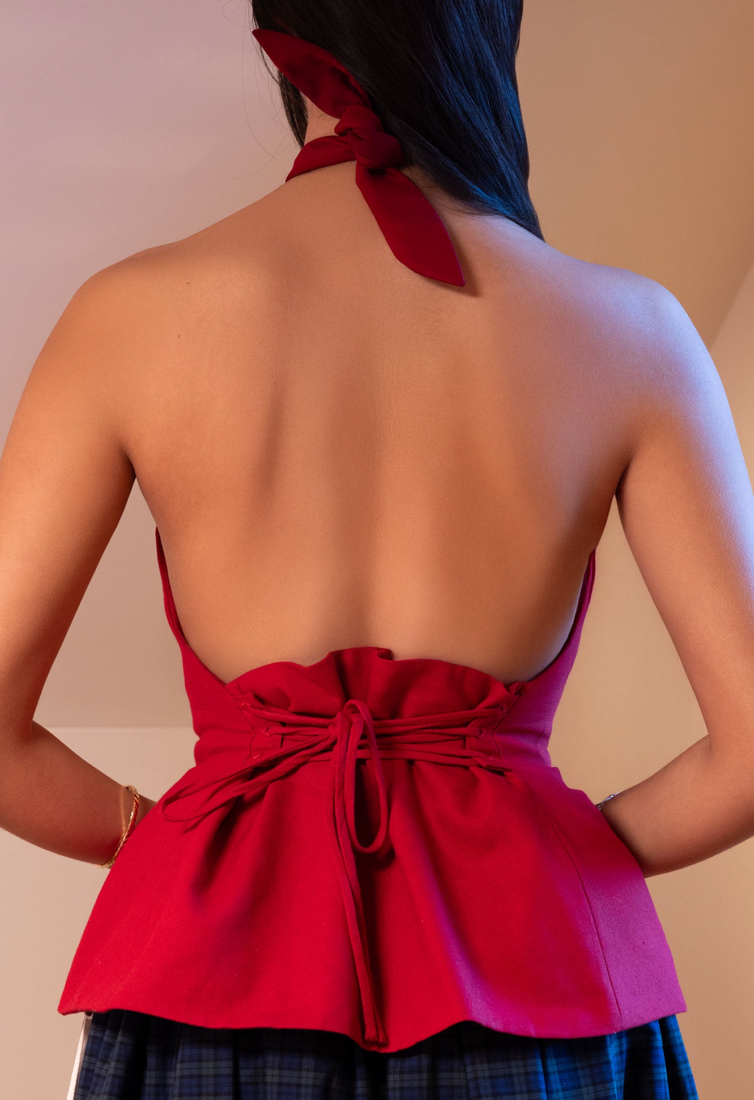 Sculpted Halter Top with silk chiffon ruching details at bust. Criss cross design at front, wrapped at back neck. Adjustable at back with cotton ties criss crossed through eyelets. Low cut back. Boning free, wire free for full focus on comfortability. Double-lined cotton canvas at body for a seamless fit.