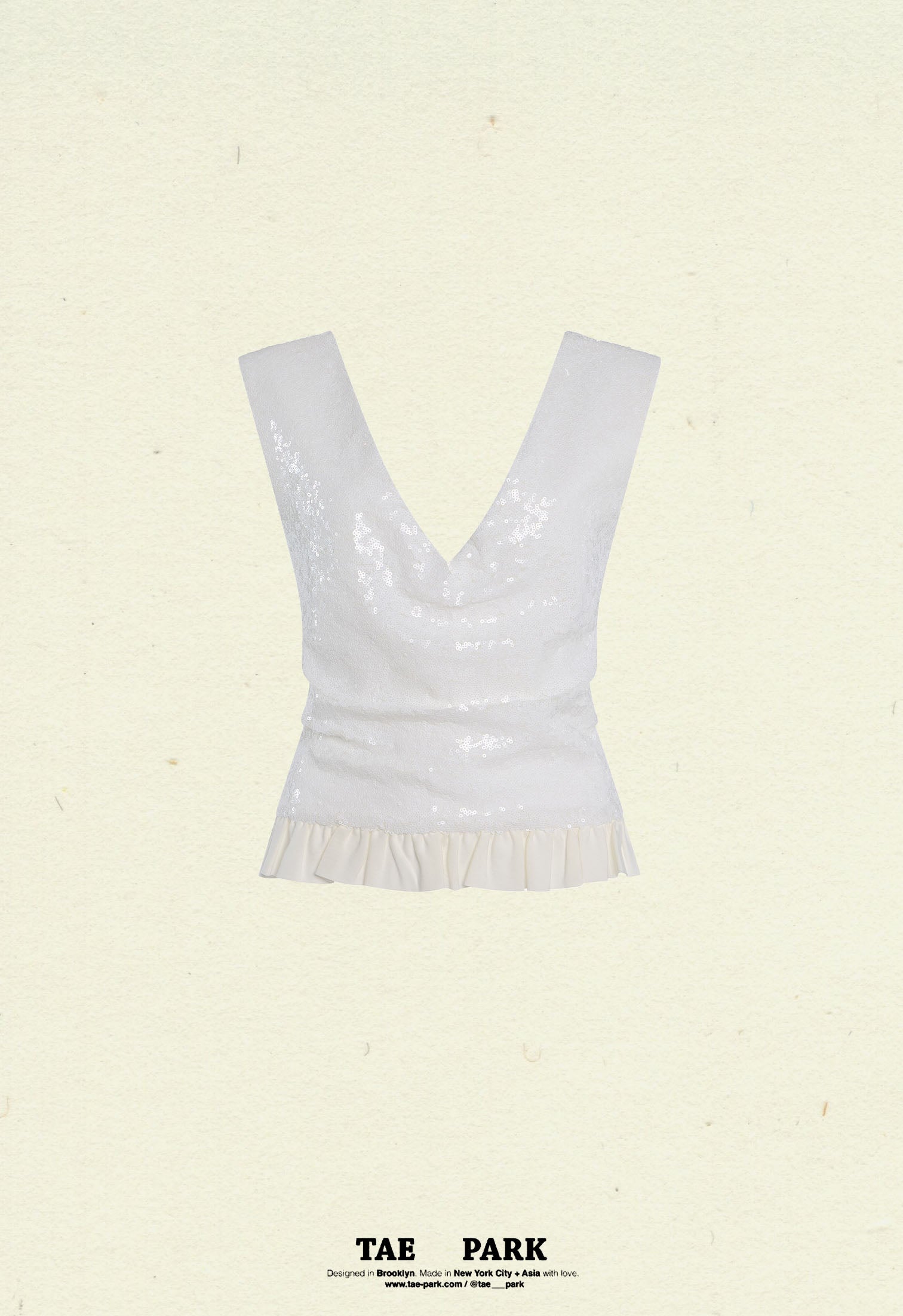Inspired by one's mother's love for florals. Our Sequin Petal Top comes with a surprise detail at back, homage to the shape of petals joint together with an adjustable cotton string ties. Draped zigzag starlight sequins lined with a soft and thick double-knit jersey. Ruffle detailing in combo at hem for a girly meets edgy take on this open back top.