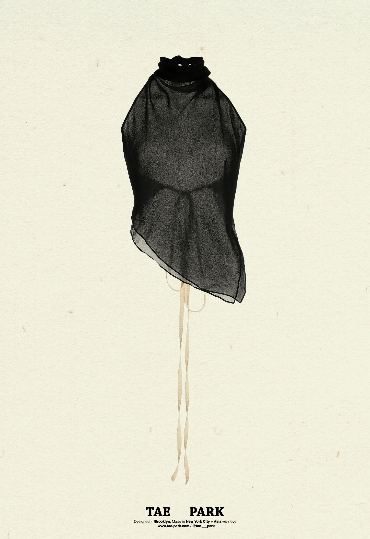 Double-lined in Silk Chiffon. Elongated cotton twill ties resembling a flying kite. Cowl neckline with self adjustable tie. Baby hem finishing.