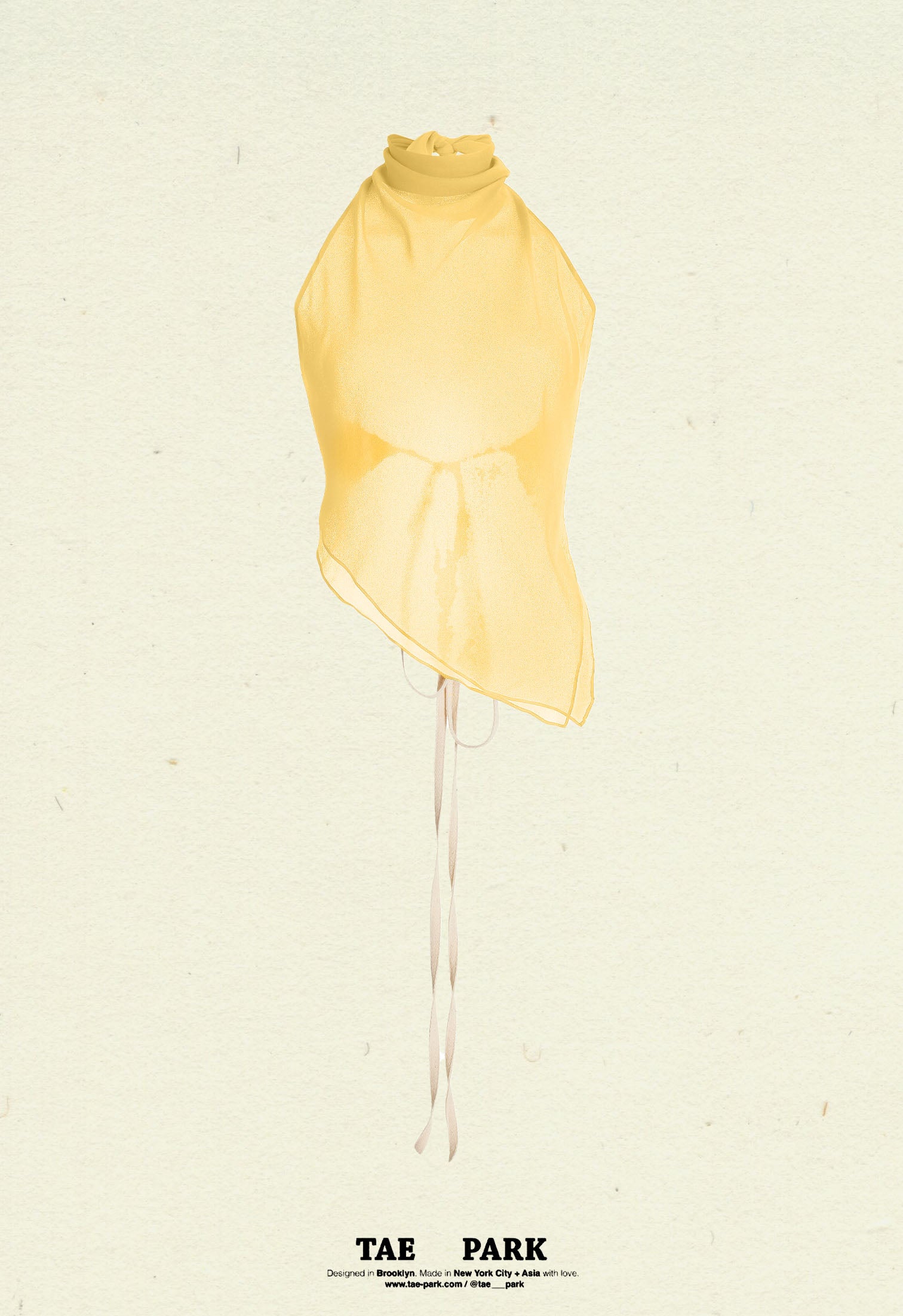 Double-lined in Silk Chiffon. Elongated natural cotton twill ties resembling a flying kite. Cowl neckline with self adjustable tie. Baby hem finishing.
