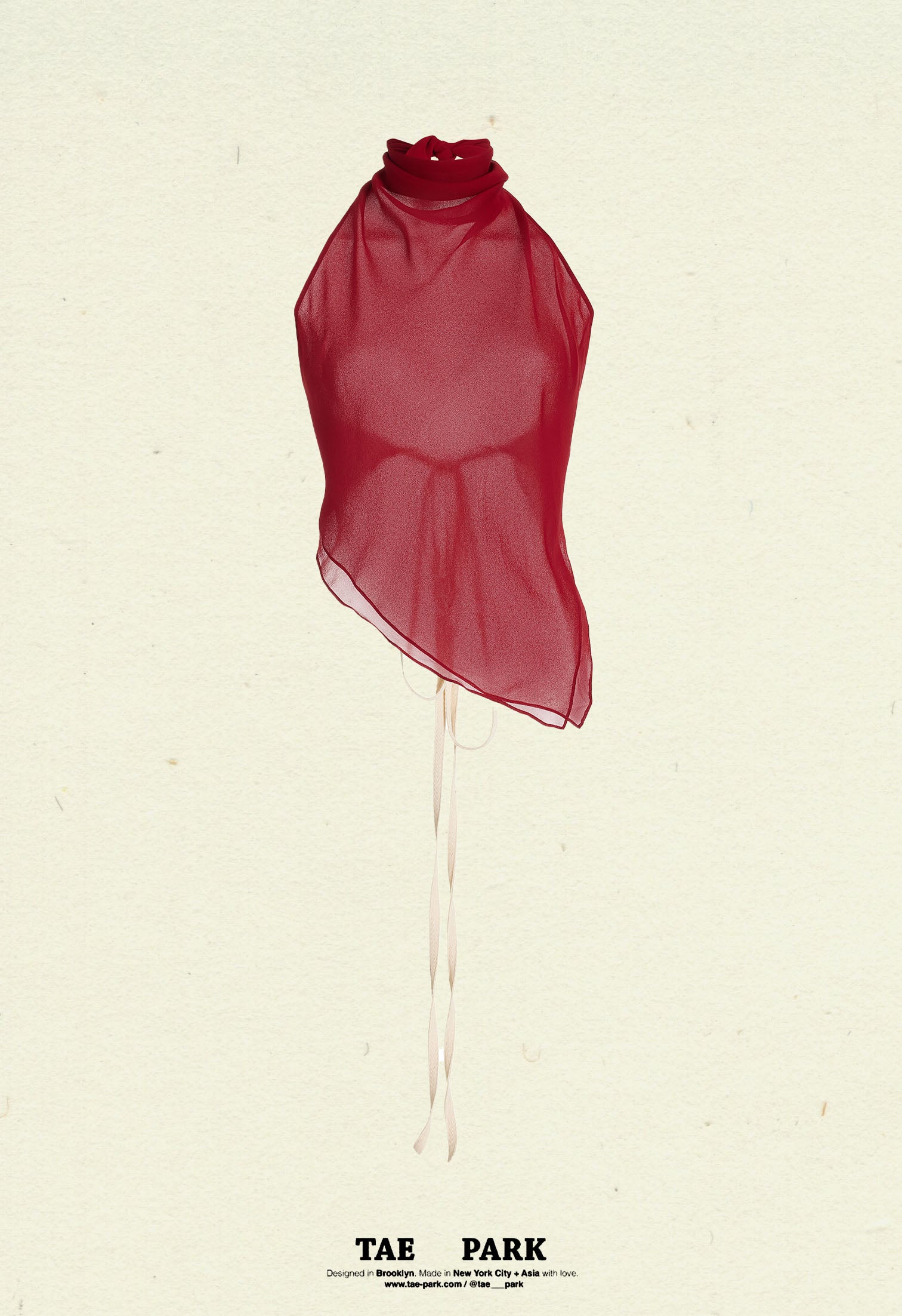 Double-lined in Silk Chiffon. Elongated cotton twill ties resembling a flying kite. Cowl neckline with self adjustable tie. Baby hem finishing.